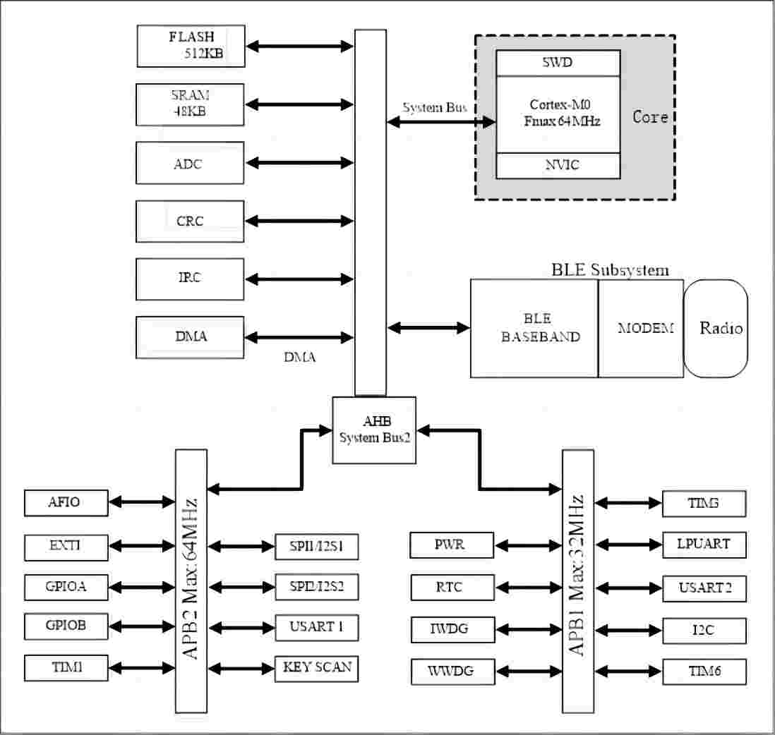 型號 藍牙協議 Flash(KB) SRAM(KB) CPU頻率 電壓 RTC SPI I2S I2C USART LPUART GPIO AMIC DMA 10位ADC CRC 封裝 PDF下載