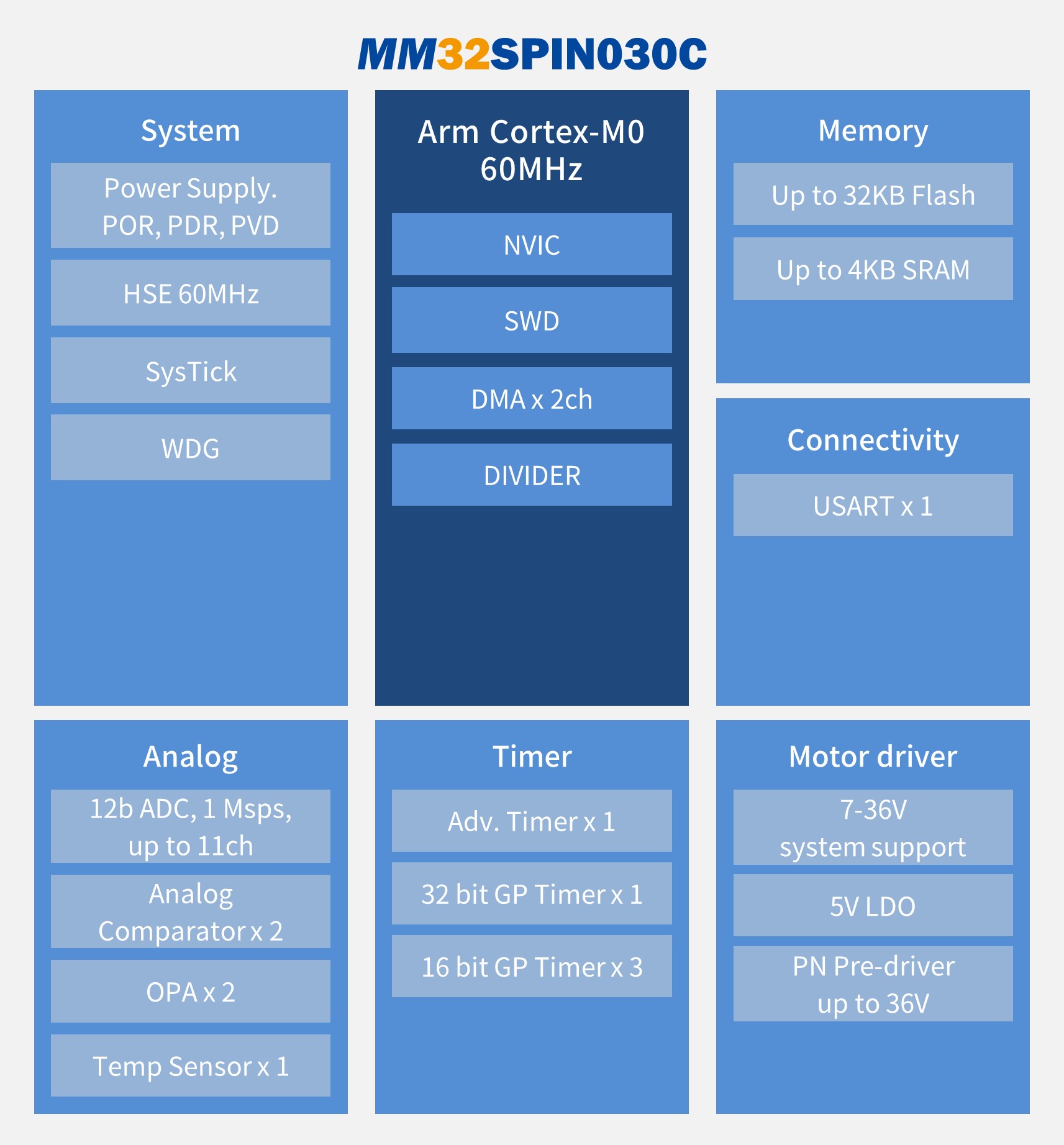 MM32SPIN030C是一款高性能單片機電機控制SOC產品,選用Cortex-M0內核,配備了電機控制所需的專用模擬外設,包括12位高精度ADC、COMP2路模擬比較器、OPAMP2路運算放大器、三相P/N格柵極驅動器,配備MC-TIM、硬件除法器HW-Div、DMA控制器等專用資源,及其32KB Flash、4KBSRAM、高主頻60mHz、17個GPIO、LDO等基礎資源。封裝采用TSSOP28和QFN28。