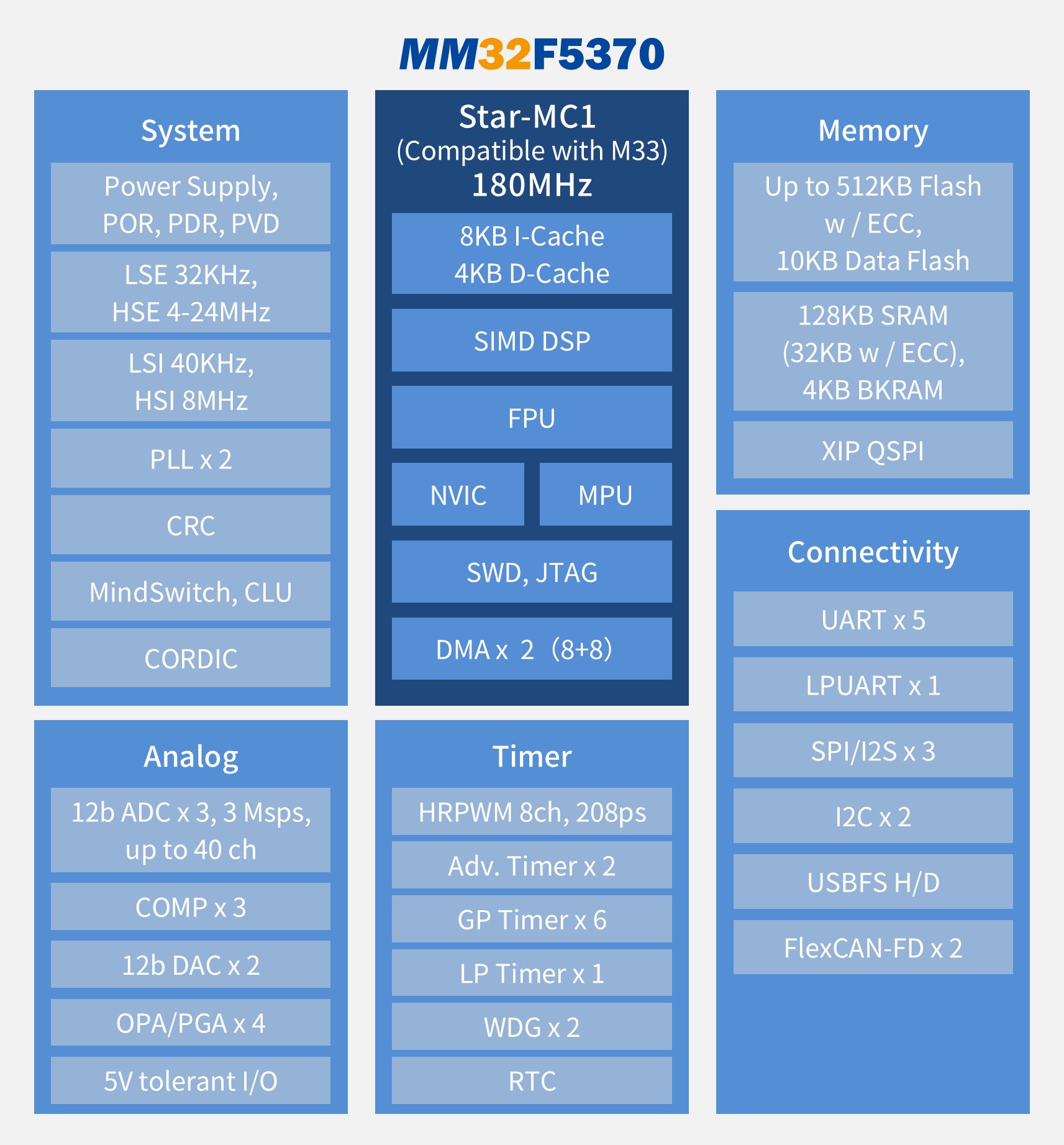 MM32F5370搭載國產(chǎn)Star-MC1內(nèi)核,基于Armv8-M架構(gòu),指令集兼容Cortex-M33,提供高達(dá)512KB flash,支持ECC,并提供分區(qū)讀保護(hù),支持代碼二次開發(fā),保護(hù)方案商利益;另有10KB Data Flash,獨(dú)立分區(qū)。提供高達(dá)128KB SRAM,其中32KB支持ECC;另有4KB retentionRAM,可在Standby模式下對(duì)數(shù)據(jù)進(jìn)行保持。提供QSPI外部存儲(chǔ)擴(kuò)展接口,并支持XIP。該型號(hào)滿足三電機(jī)應(yīng)用的實(shí)時(shí)控制需求。