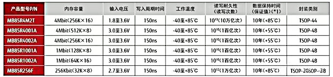 并行接口存儲器為采用TSOP或SOP封裝的256Kbit至4Mbit的產品,工作時的電源電壓為3.3V,但MB85R4M2T能夠在1.8V-3.6V的大范圍內進行工作。封裝方式為能夠與SRAM兼容的TSOP或SOP。